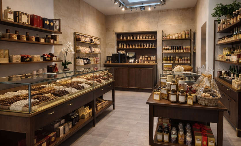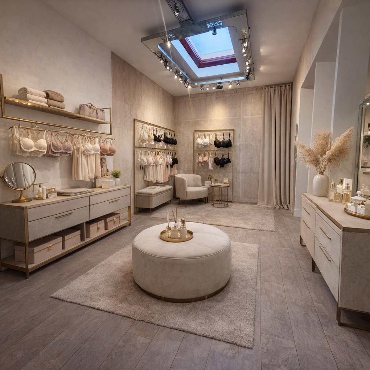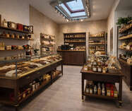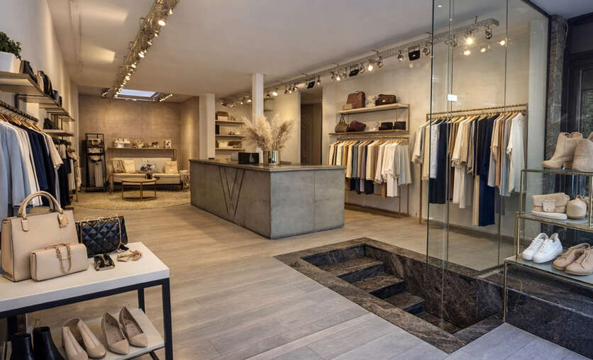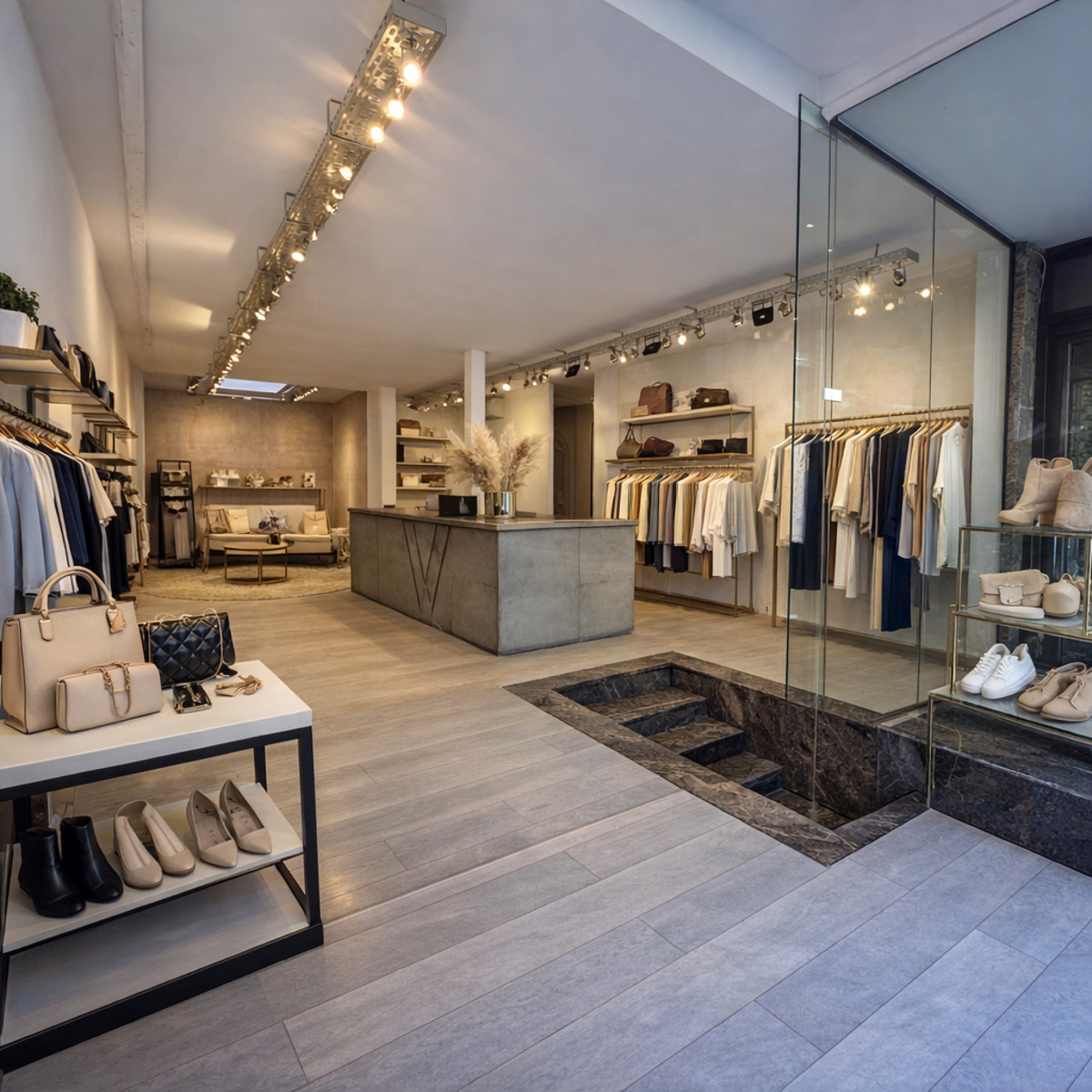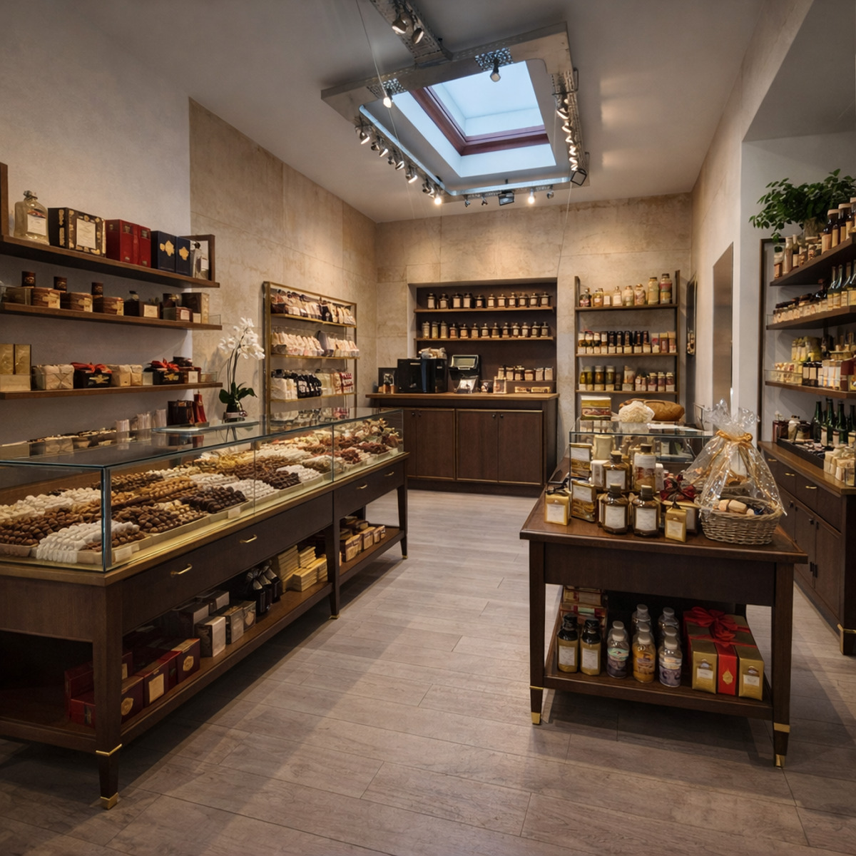 De handelsruimte is momenteel ingericht als een ruime open winkelruimte met centrale toonbank en is voorzien van een uitgebreid verlichtingssysteem met railspots, waardoor producten of presentaties optimaal kunnen worden uitgelicht. Achteraan bevindt zich een bijkomende zone met lichtinval via een lichtkoepel, wat extra mogelijkheden biedt voor inrichting of presentatie.
